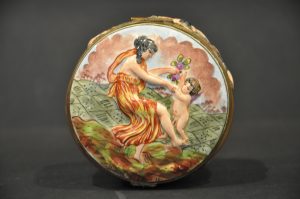 Représentant sur le couvercle un relief peint à la main détaillé d’une dame et un angelot.