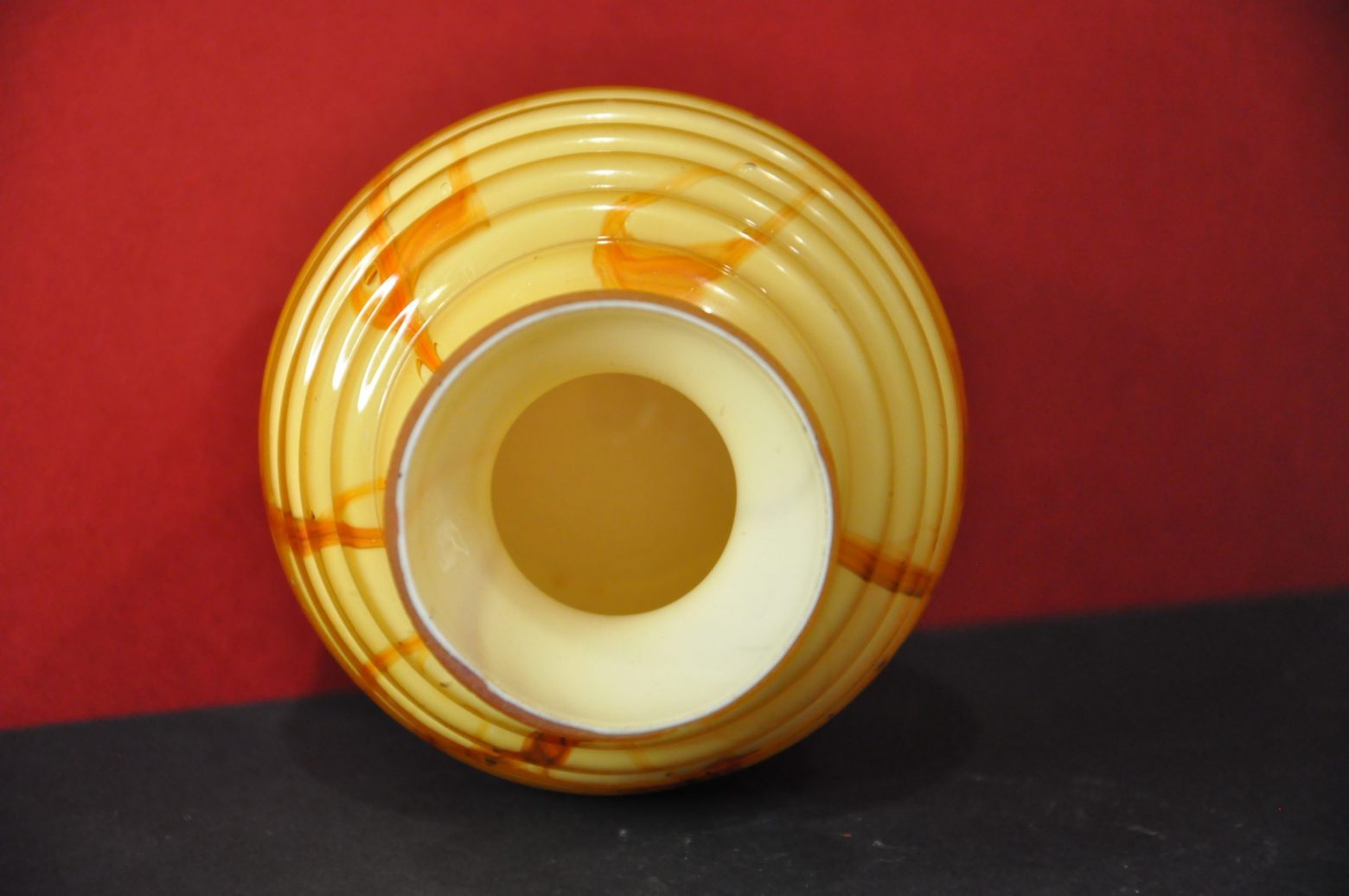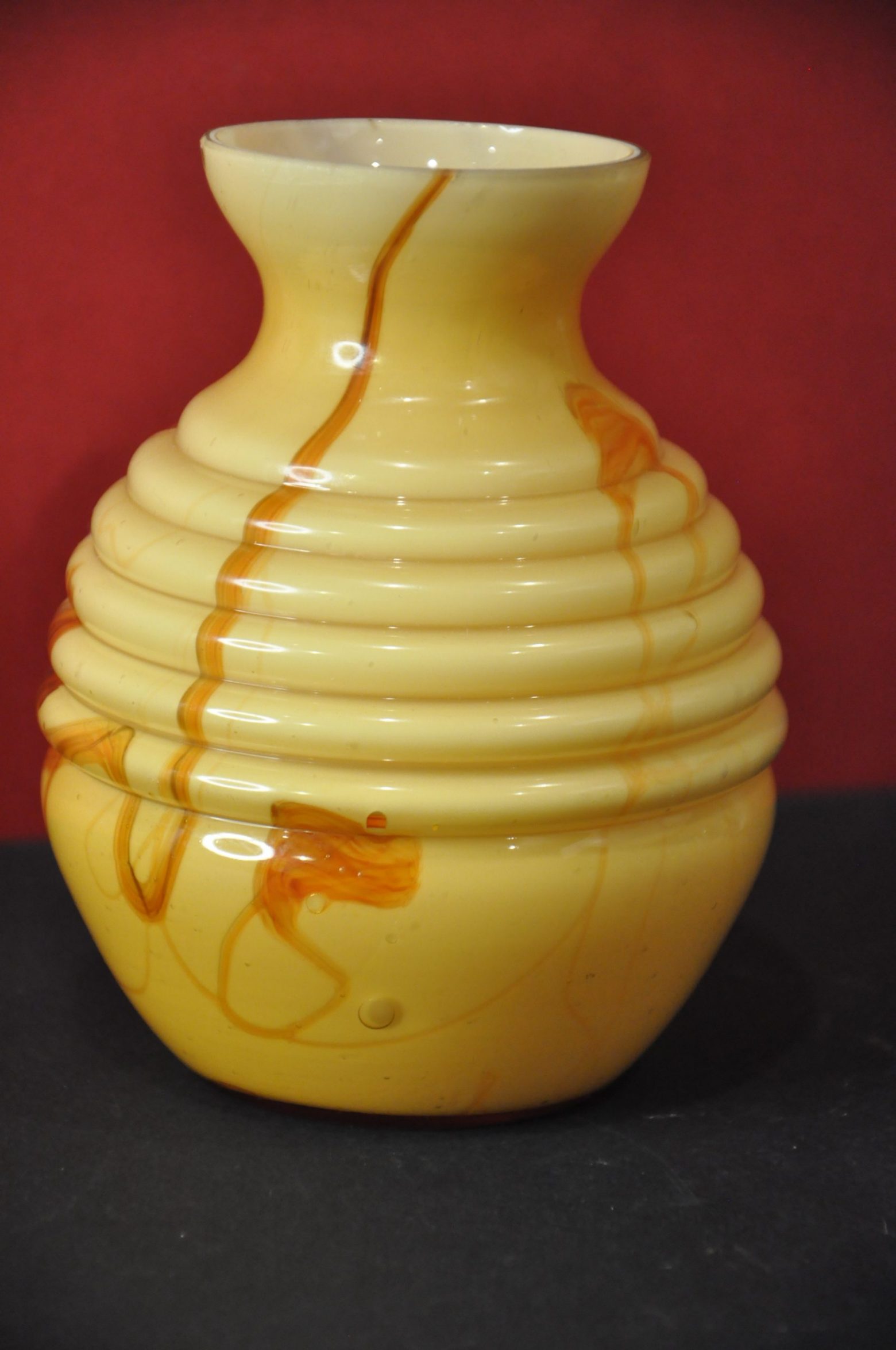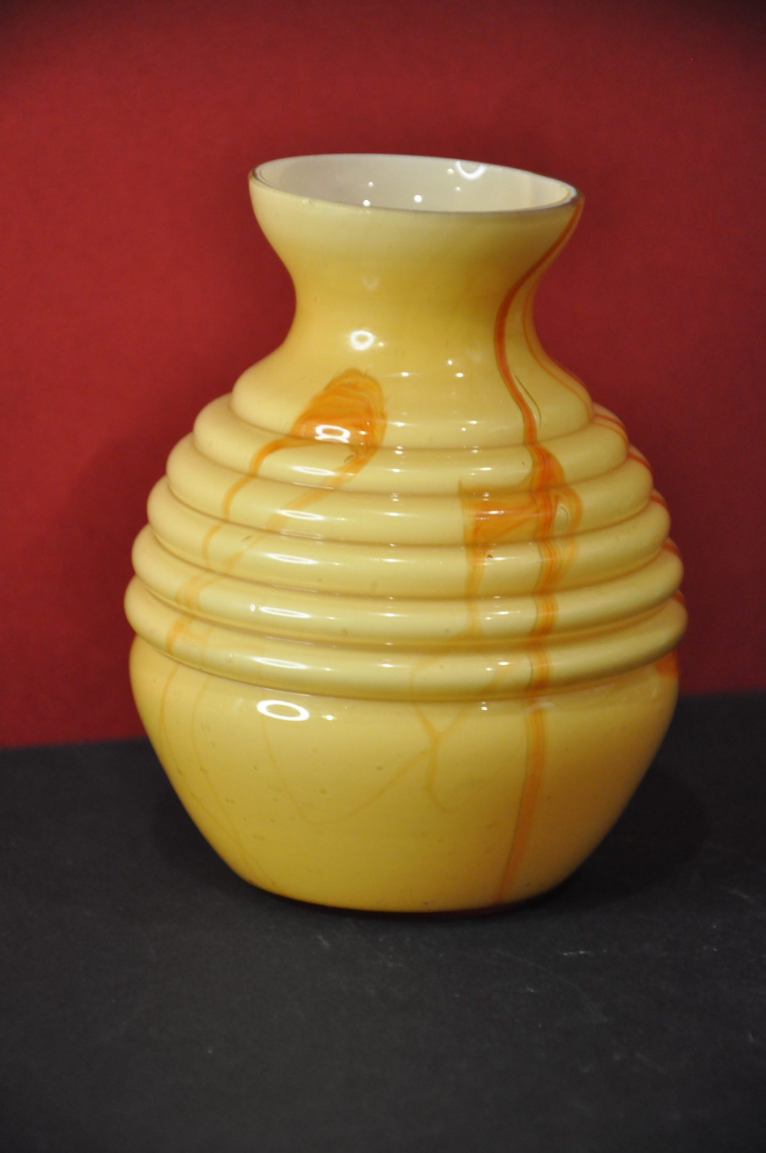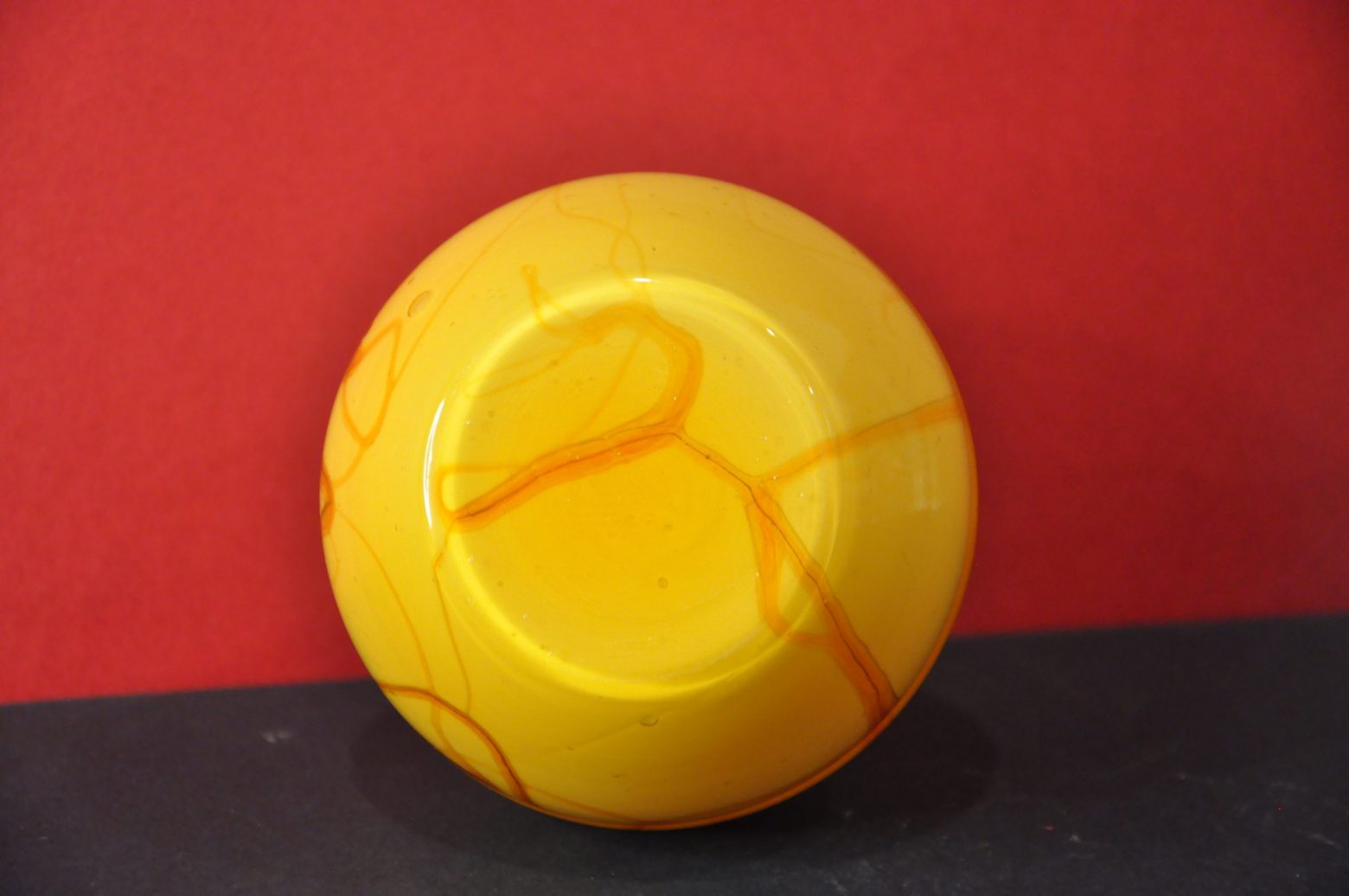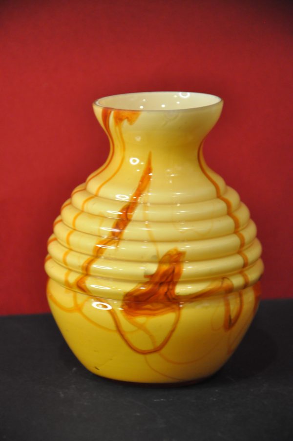 Cette pièce emblématique de l’Art Déco présente des formes épurées et des couleurs jaune avec des veines orangées.