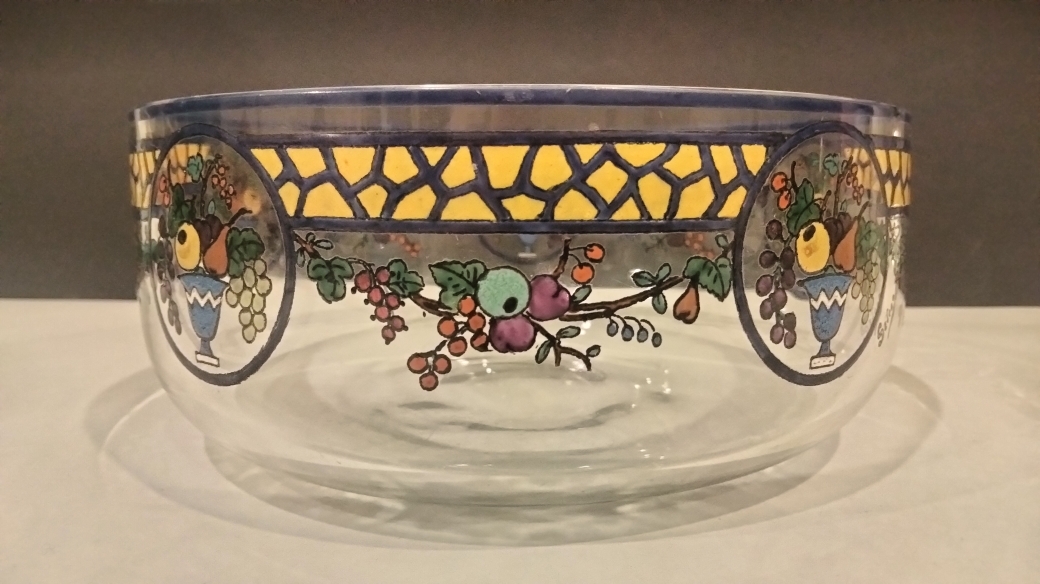 Cette pièce du style Art Déco du XXe siècle se distingue par son riche décor émaillé :Des médaillons finement exécutés représentant des coupes de fruits (raisins, pomme, poire).