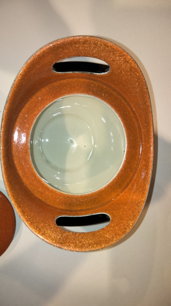 Ce pot se caractérise par son élégante combinaison de couleurs : un noir mat à l’extérieur, contrastant avec un orange vif à l’intérieur et sur les bords sa surface présente une partie granitée qui ajoute une texture tactile et visuelle distincte.