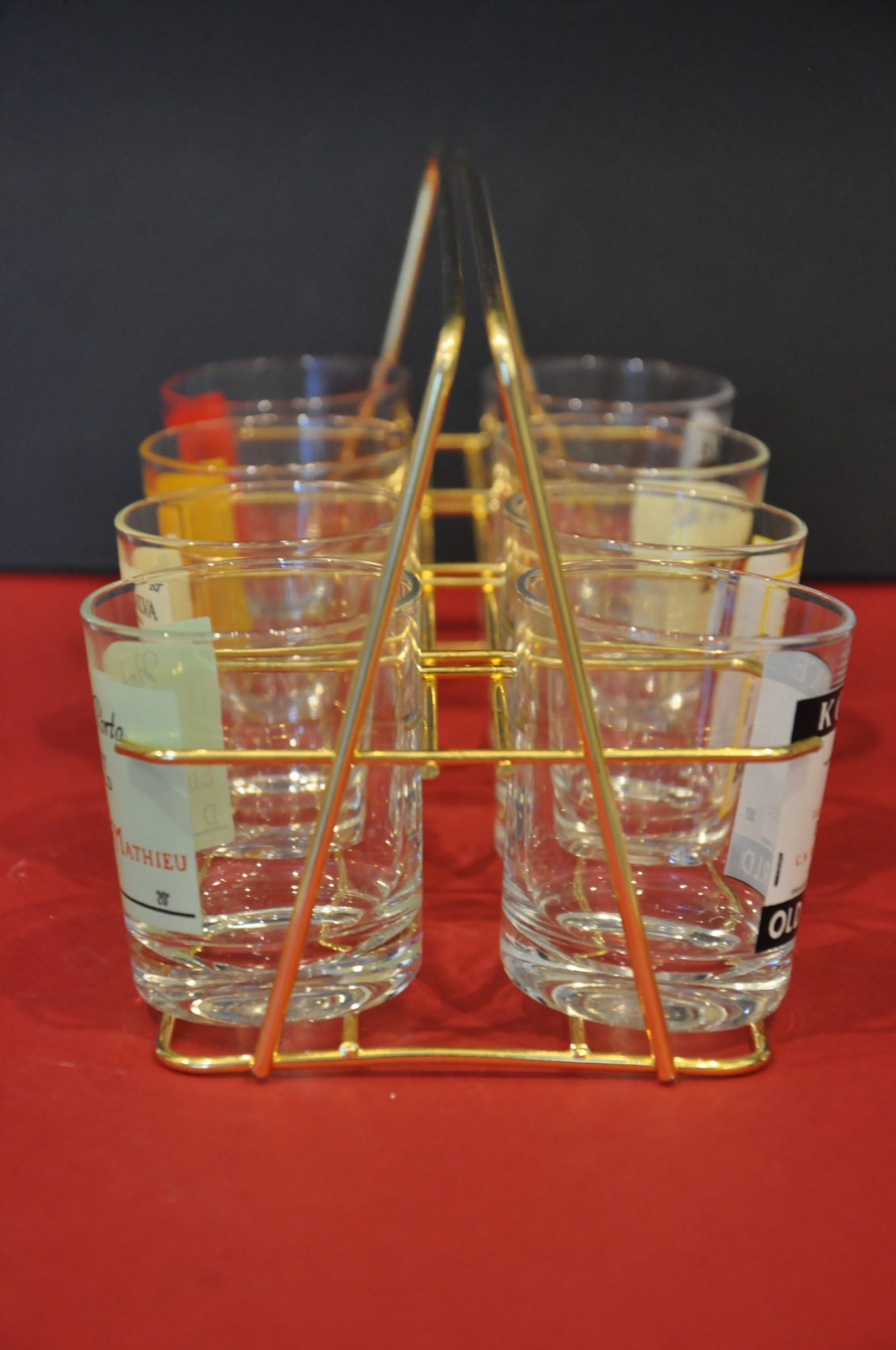 Ensemble vintage de 8 verres à Porto avec publicité dans son panier en metal dor