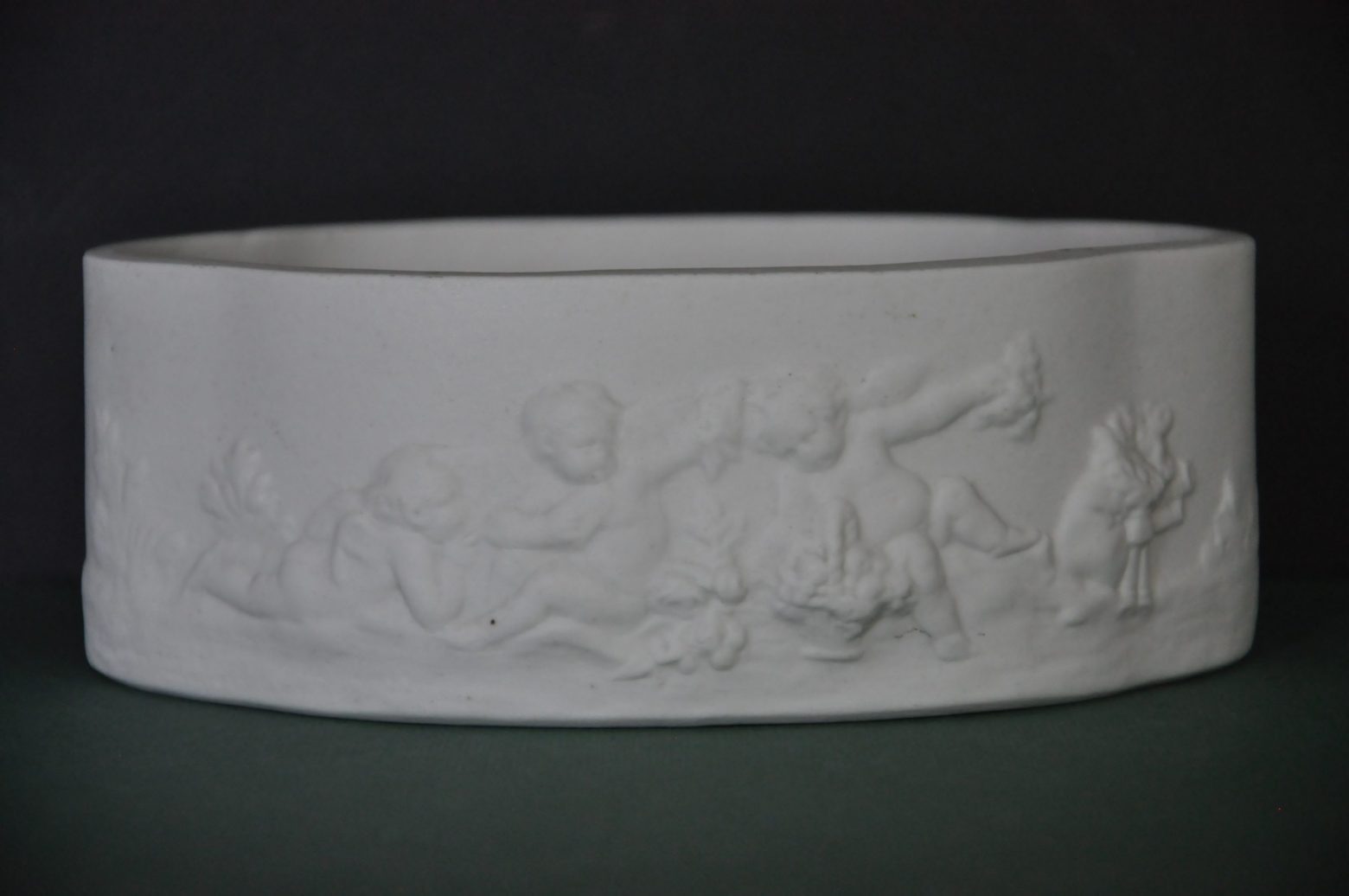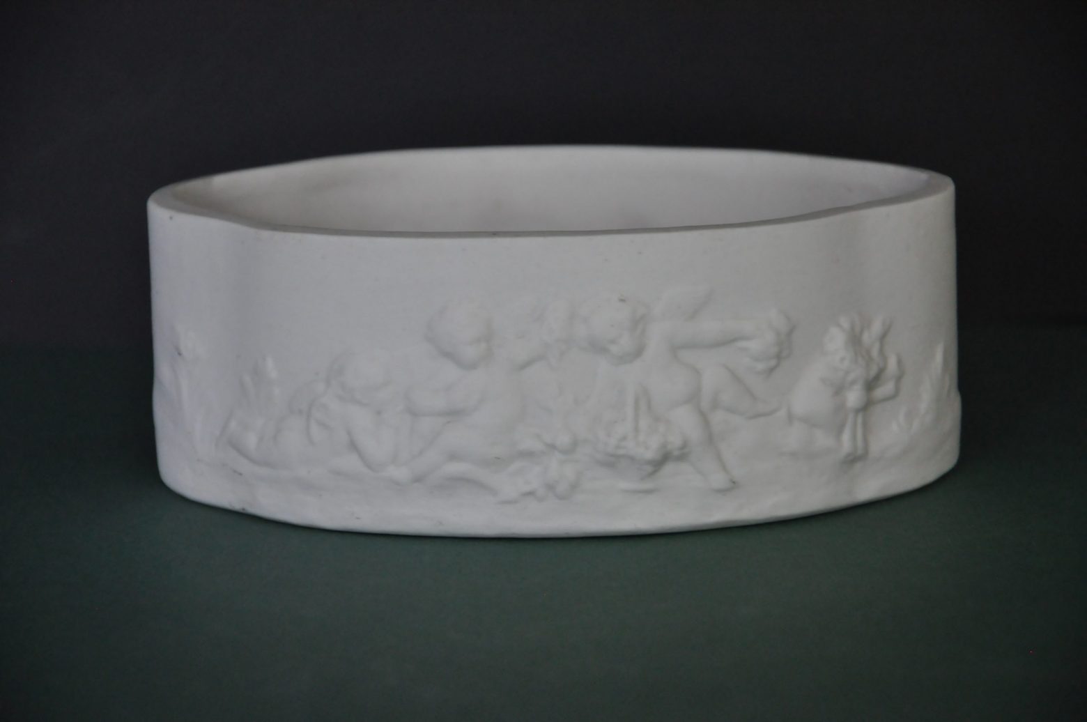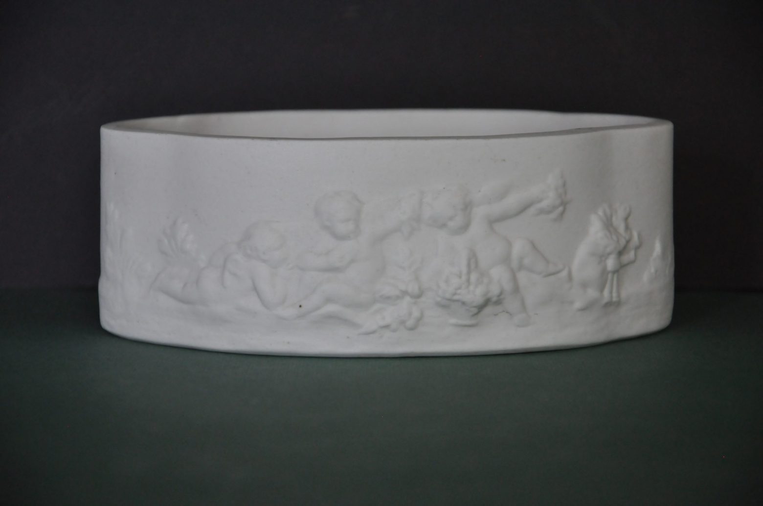 Superbe jardinière en biscuit de porcelaine, ornée de motifs délicats d’angelots ou de putti.