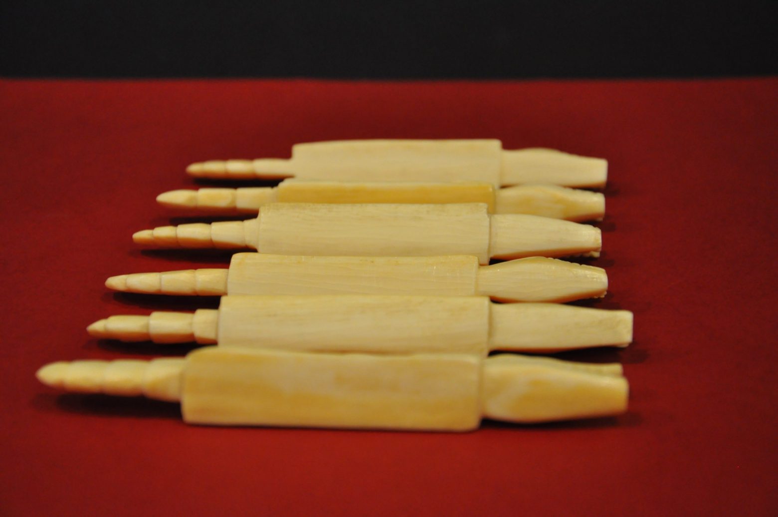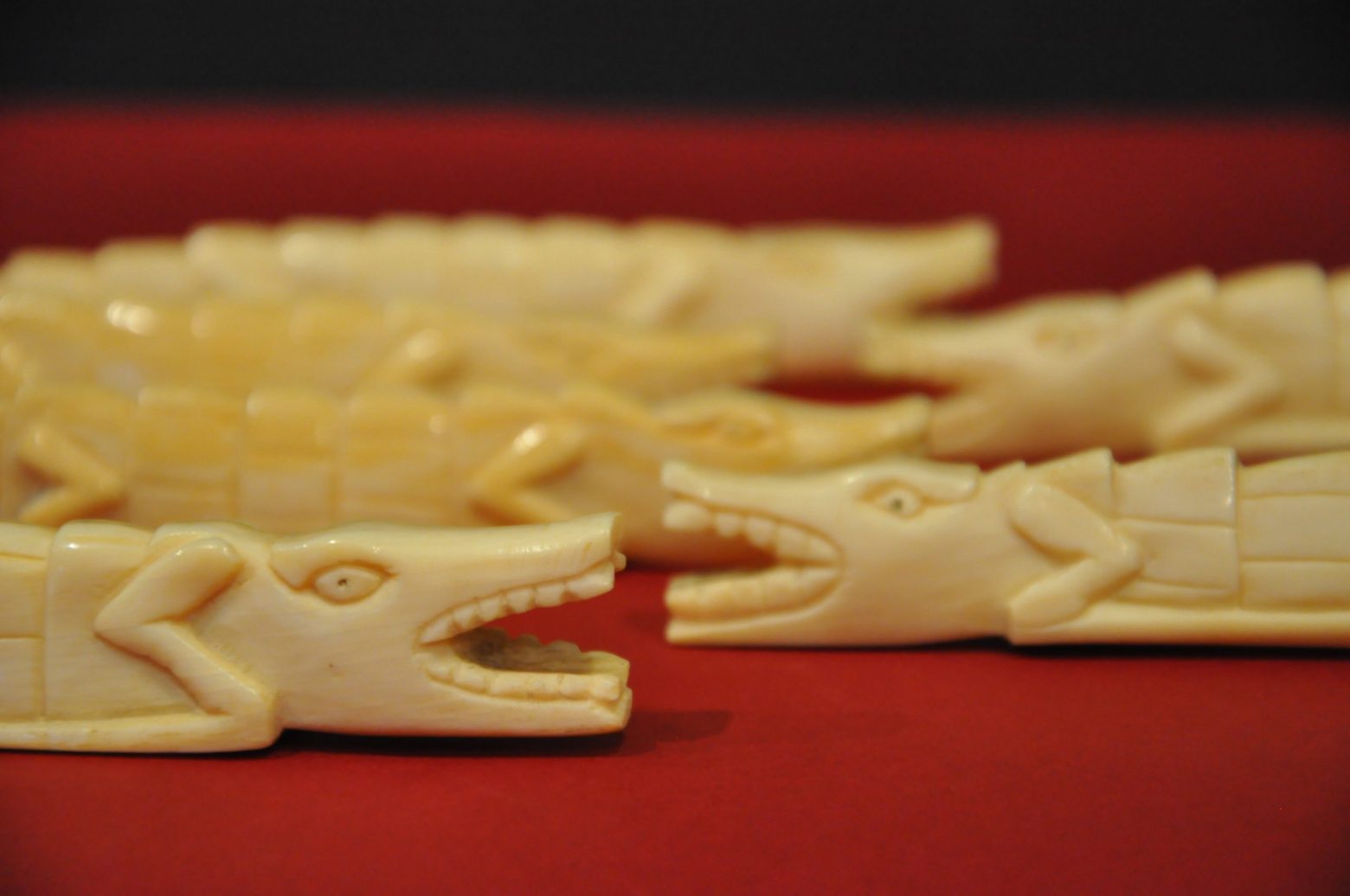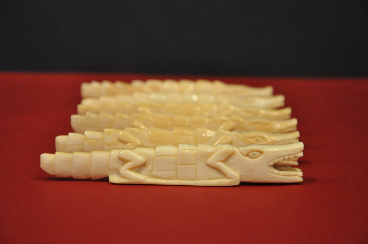 Lot de 6 porte-couteau en ivoire sculpté, représentant des crocodiles.