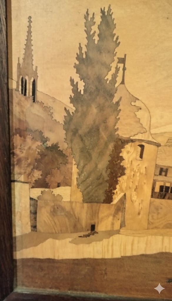 Marqueterie alsacienne, représentant la ville de Thann et signée HANS
