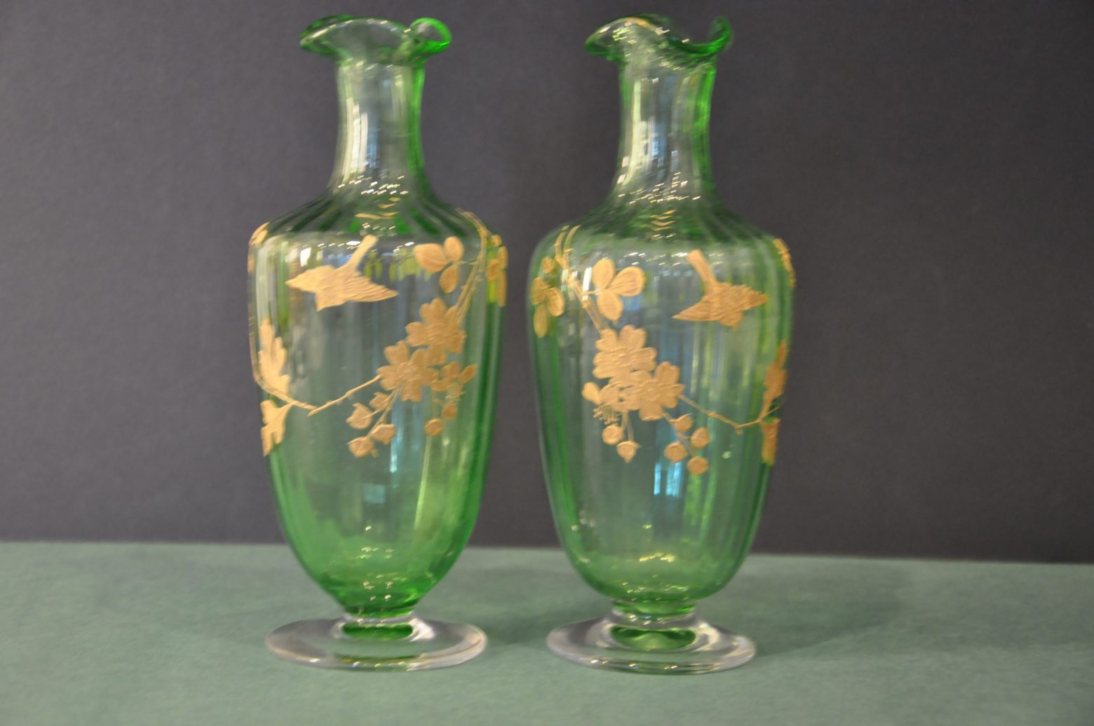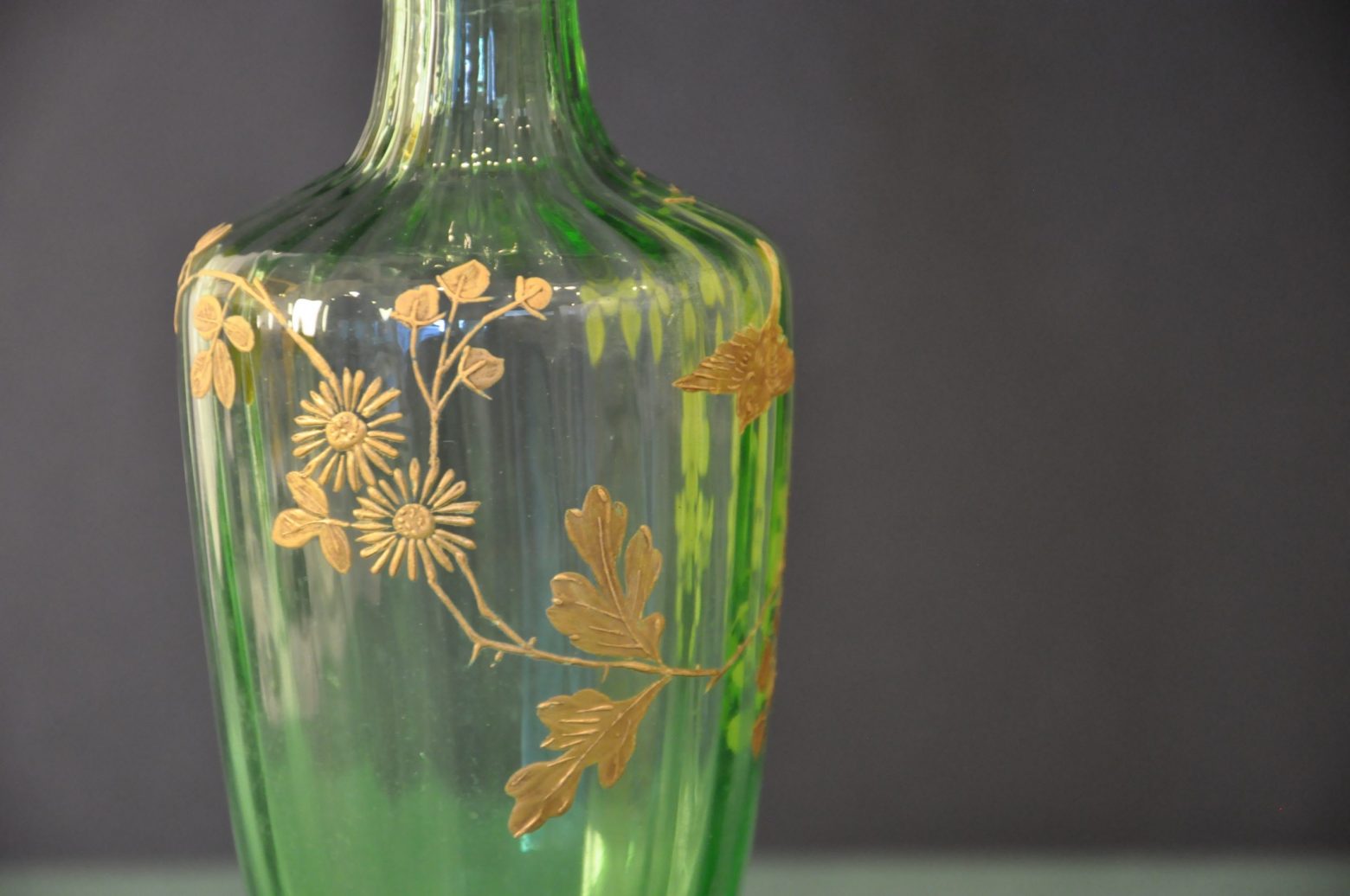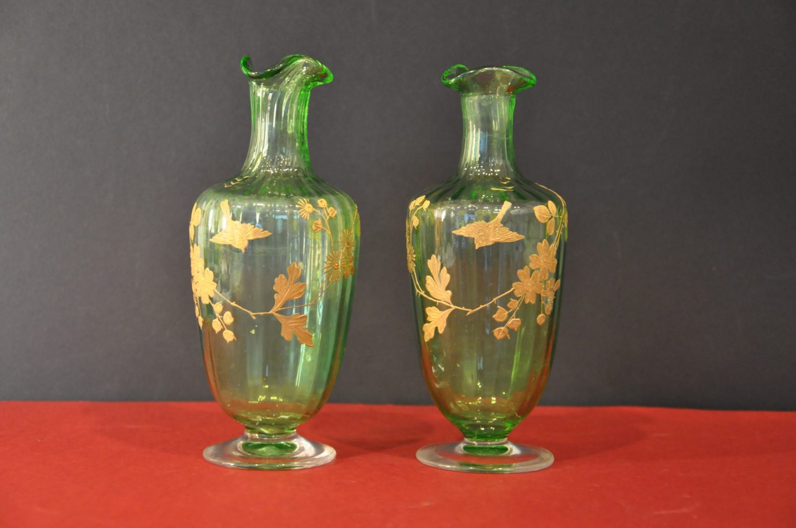 Paire de carafon en Cristal vert emaillé d’or art nouveau (Montjoie ? 1839-1916)