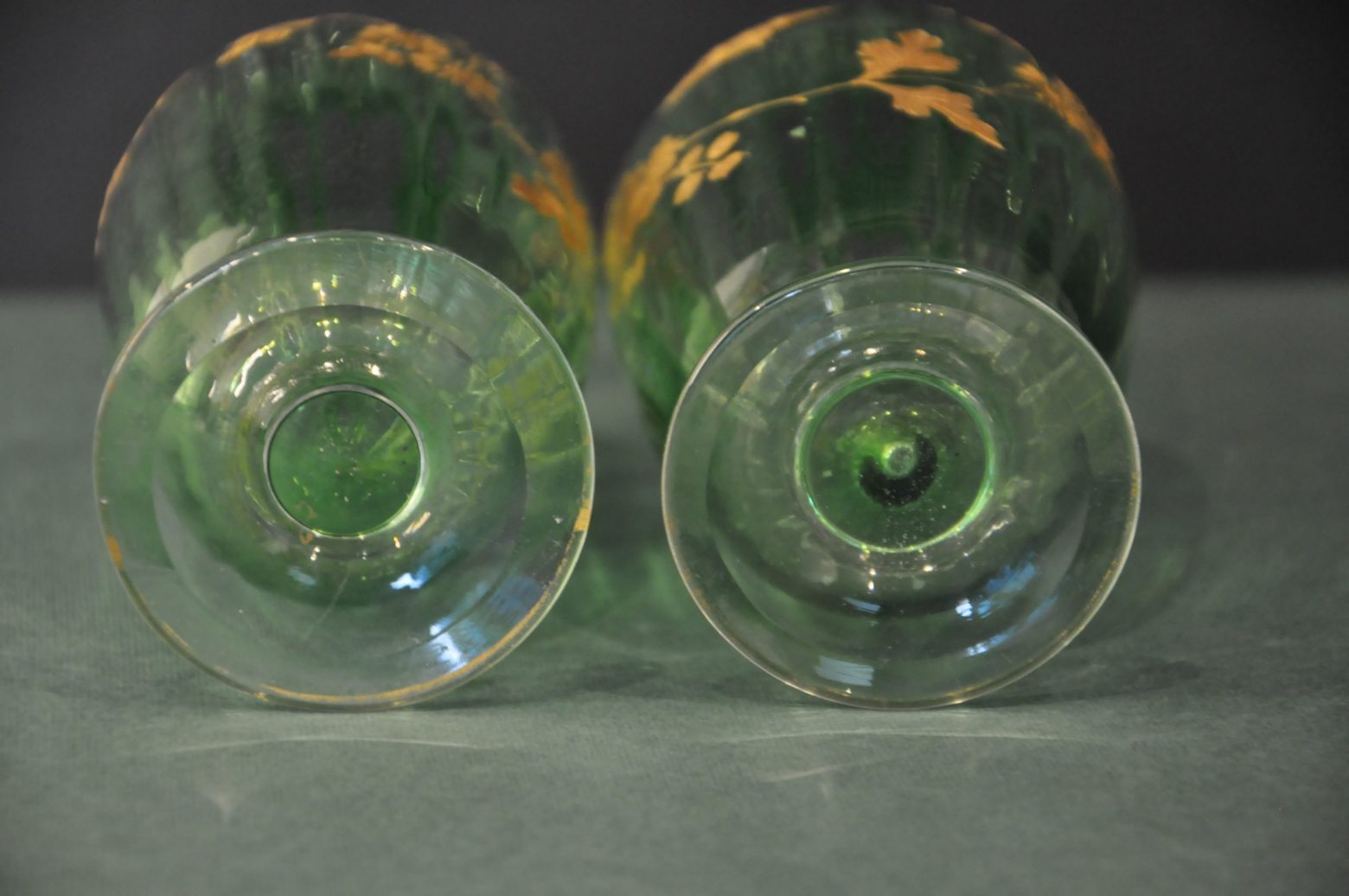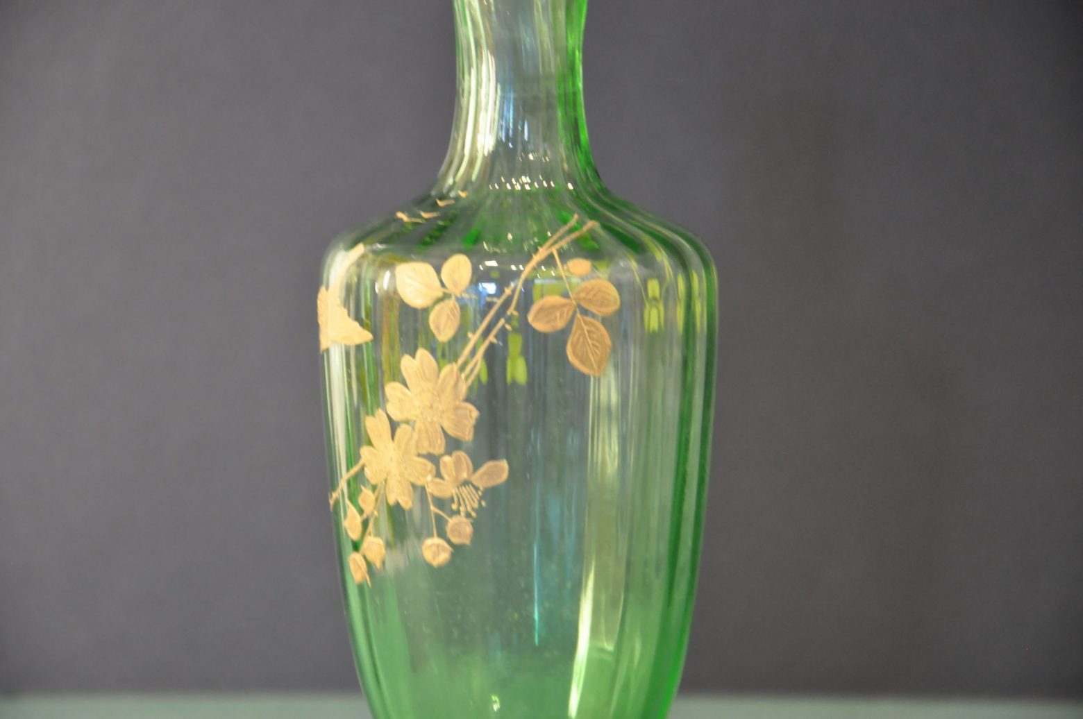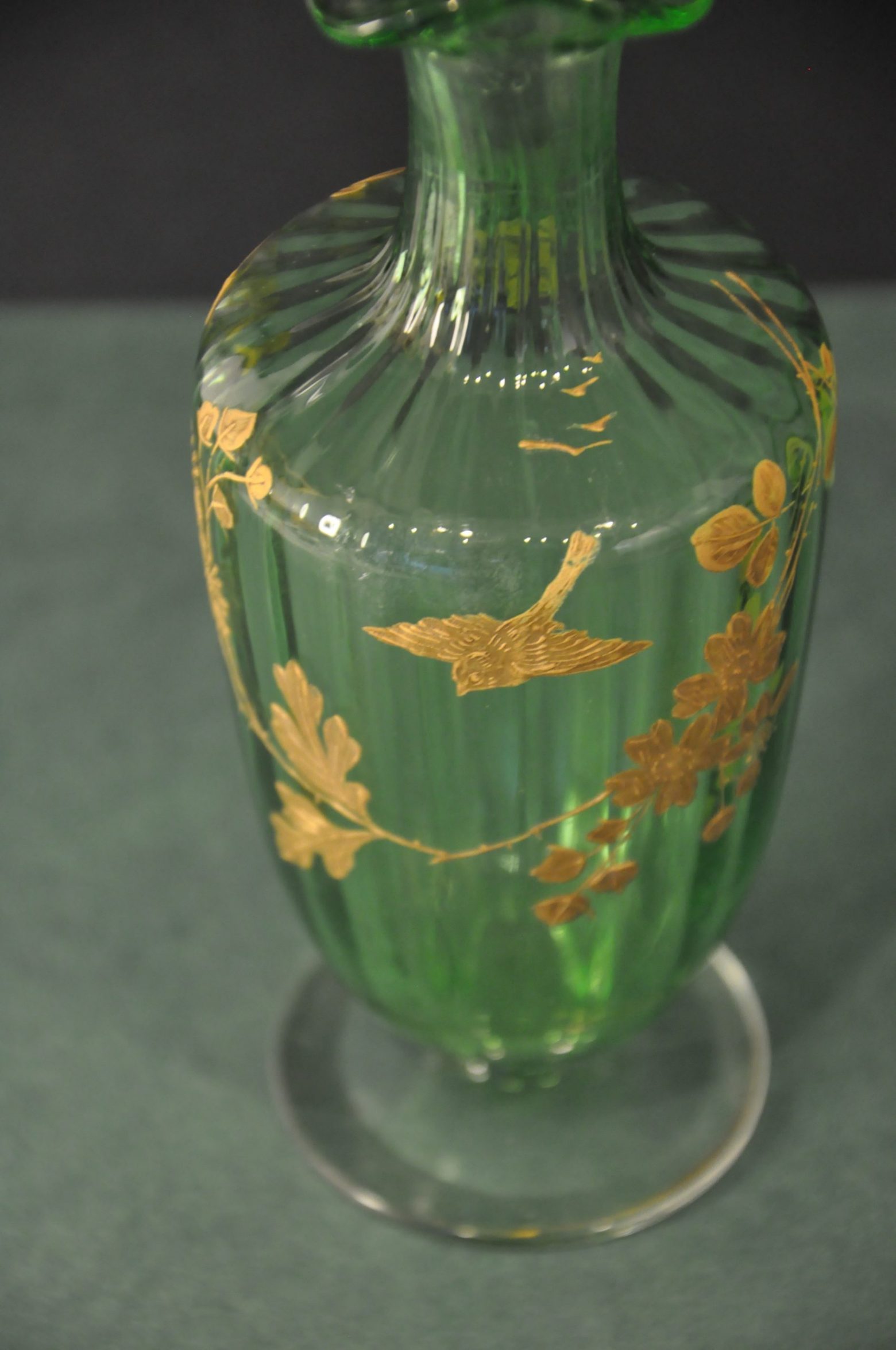 Paire de carafon en Cristal vert emaillé d’or art nouveau (Montjoie ? 1839-1916)