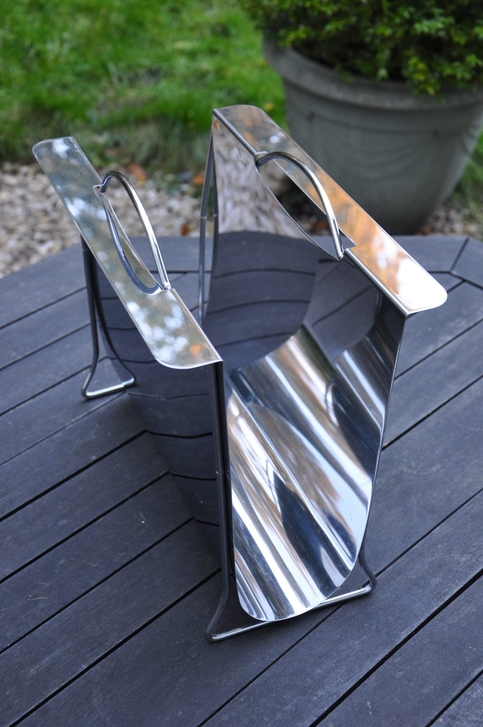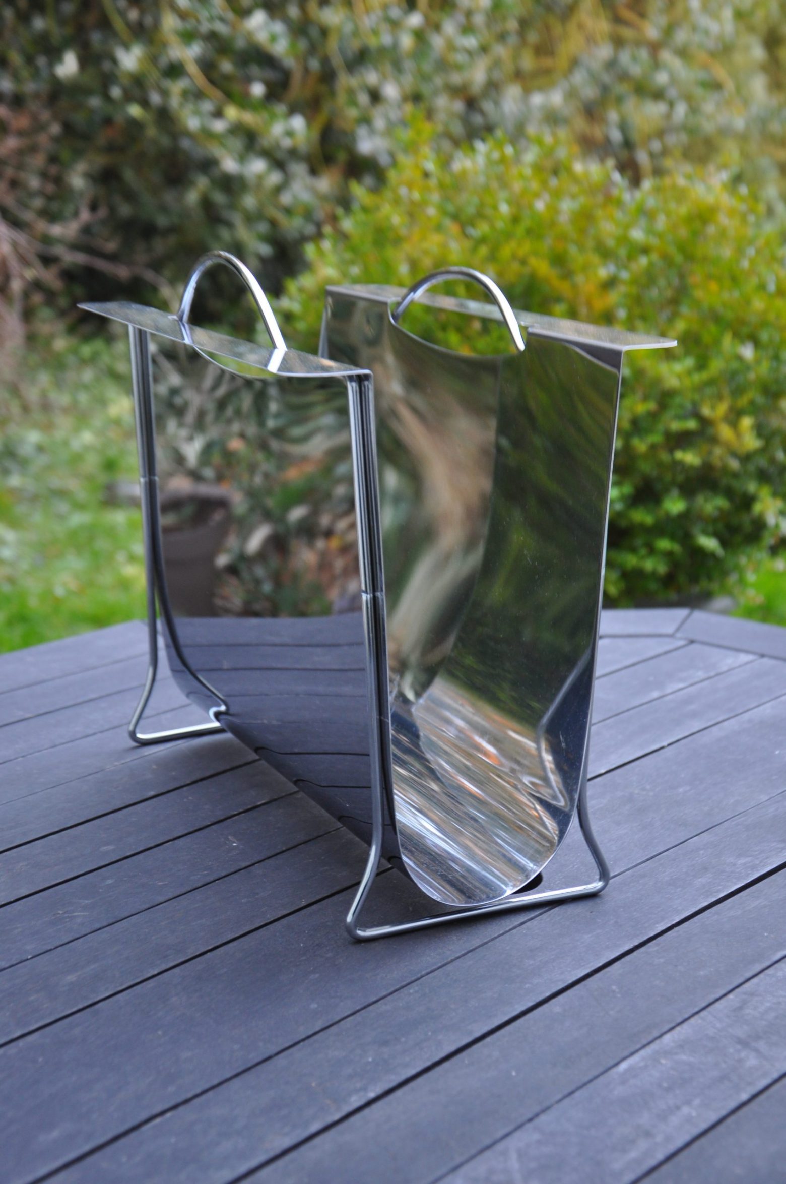 Porte-revues ou porte-vinyles en inox , création du designer française Maria Pergay, connue pour son travail de l’acier inoxydable et ses créations aux lignes pures et élégantes.