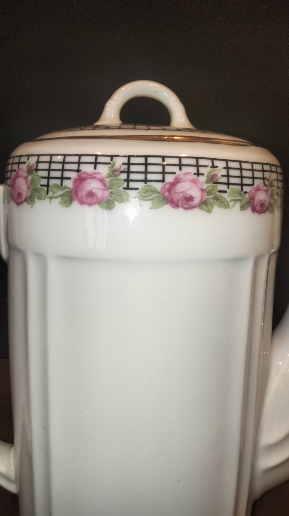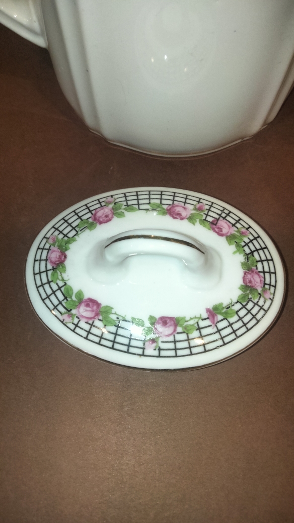 L’ensemble est orné d’un délicat décor de roses roses souligné par un liseré quadrillé noir et des touches dorées.
