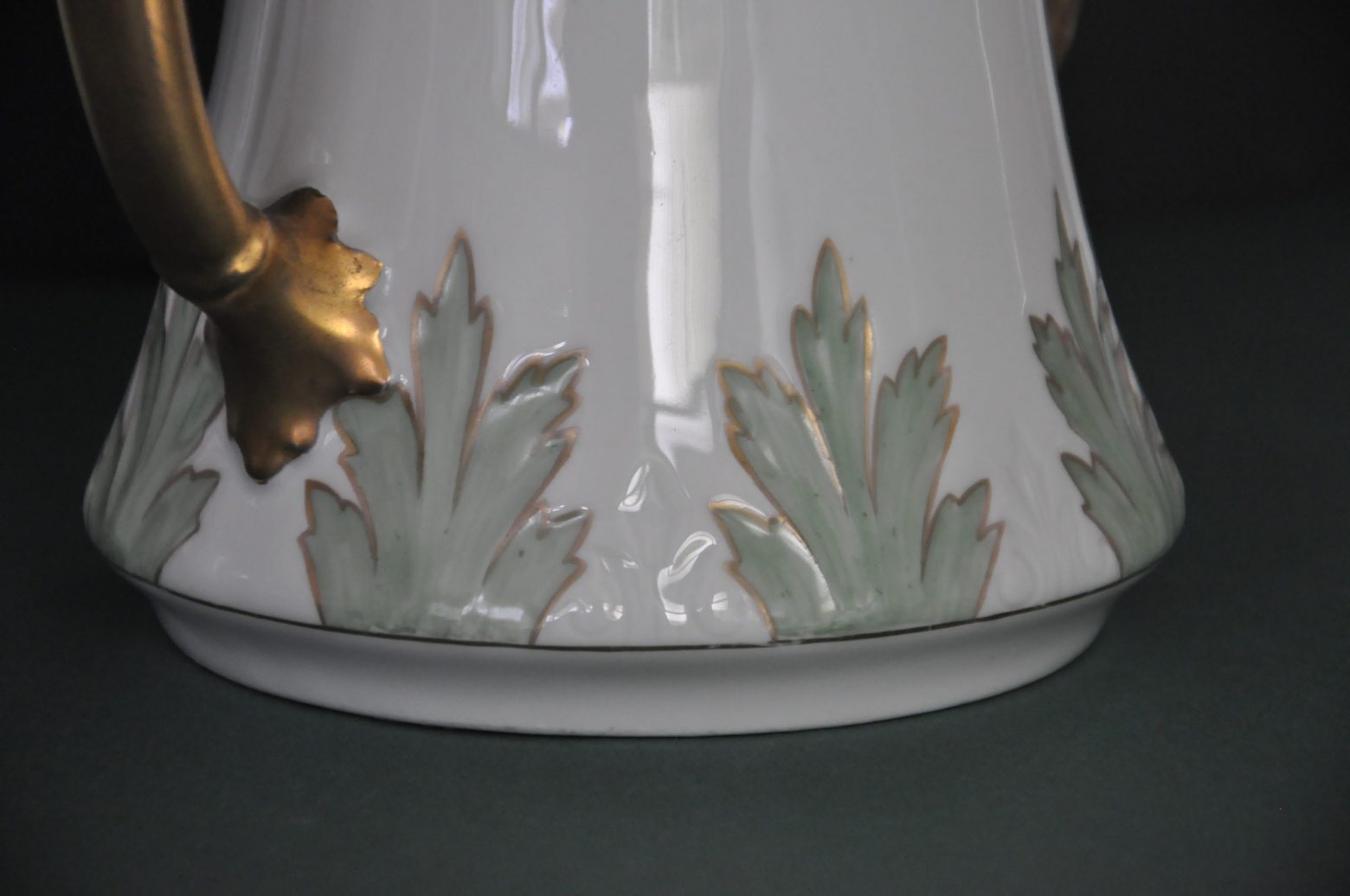 Le service est décoré de motifs de feuilles vertes, avec des détails dorés sur les anses de la cafetière, du sucrier et du pot à lait, ainsi que sur le bec verseur et les prises des couvercles. Les anses des tasses sont également ornées de dorure.