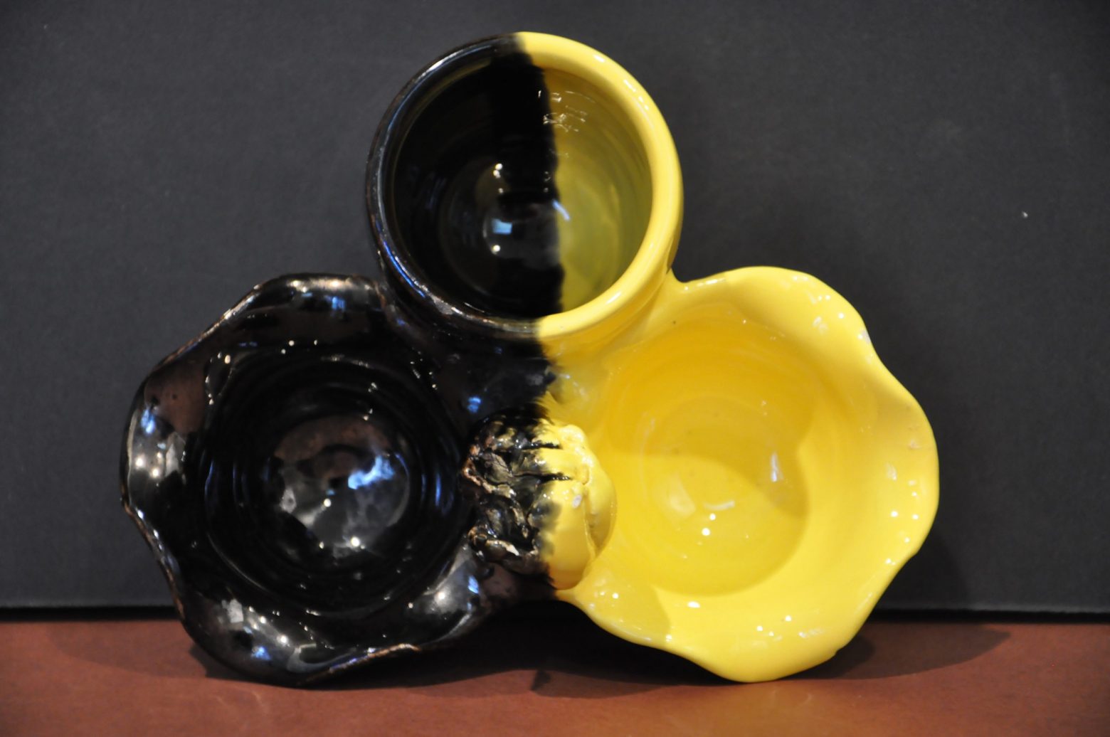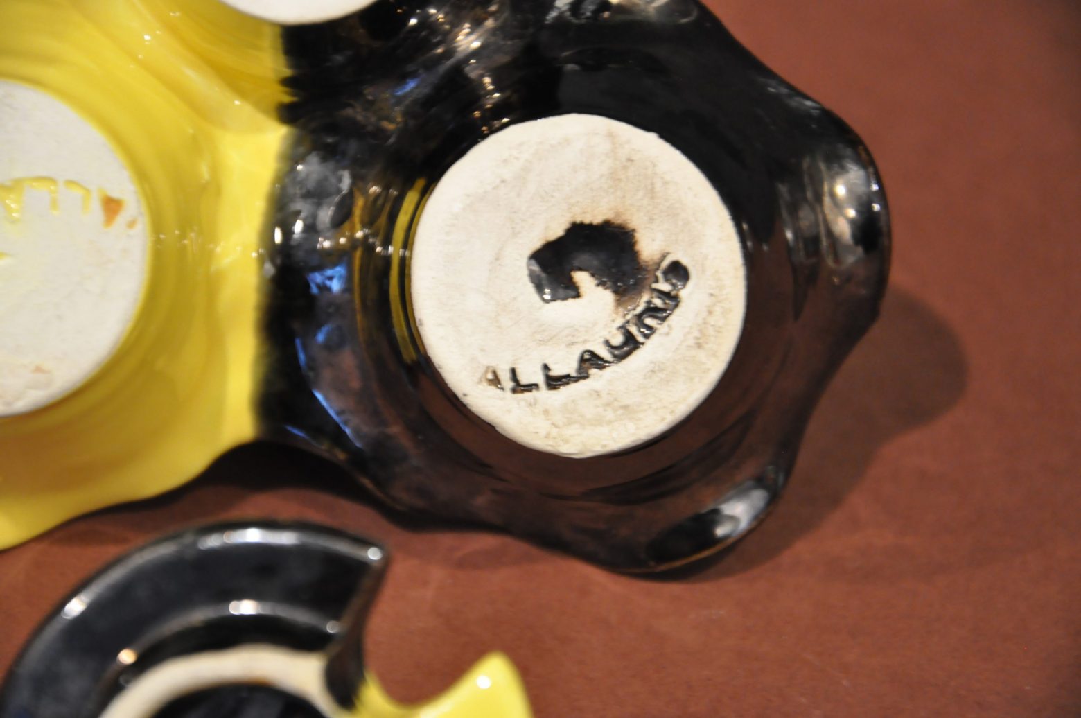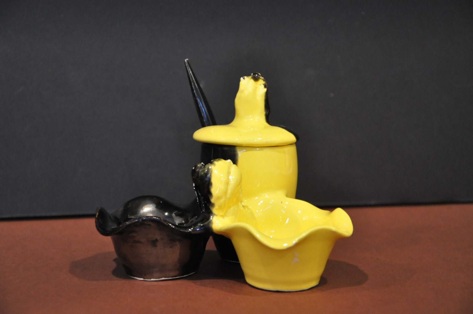 En une seule pièce: salière, poivrière, et moutardier avec son chapeau et sa cuillère