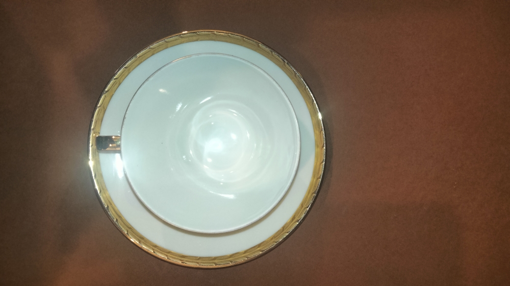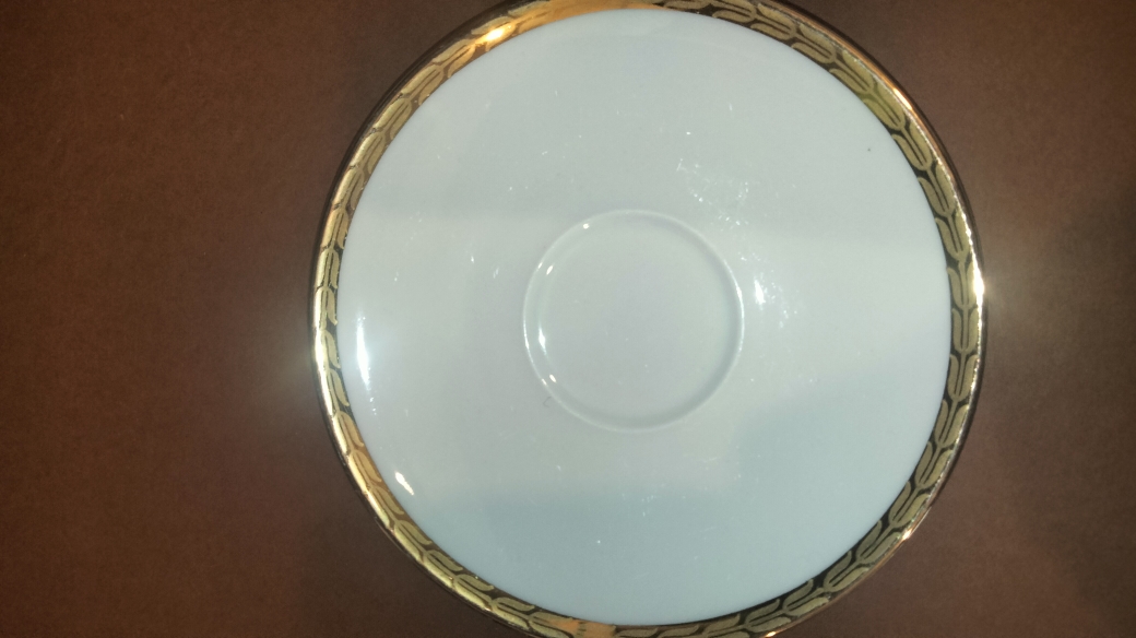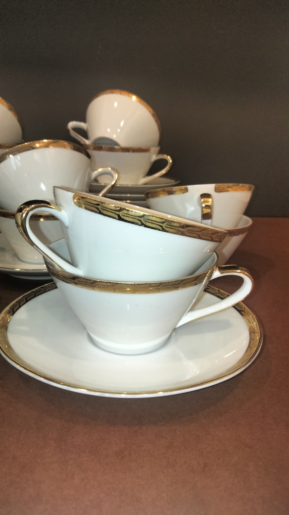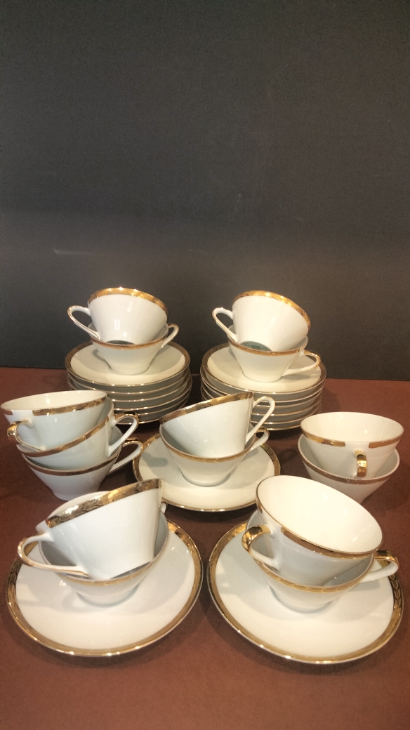 Design : Porcelaine blanche avec une bordure dorée (or fin) sur le buvant des tasses et le contour des soucoupes.